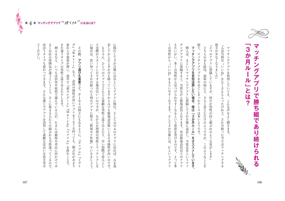 そこで、著者が培ってきた恋愛ノウハウと、男性の立場からの視点、たくさんの方々の実体験をリサーチして、「マッチングアプリ時代でも通用する、最新版の失敗しない恋活・婚活のメソッド」を詰め込んだのが本書です。
