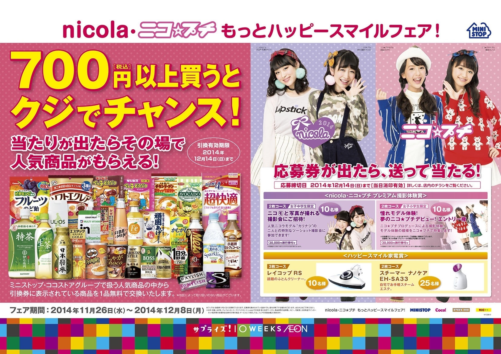700円以上のお買い物で、店内の人気商品や 応募券を集めて人気雑誌“nicola”・“ニコ★プチ”撮影体験やグッズが当たるチャンス! “もっとハッピー スマイルフェア!”11/26(水)より開催