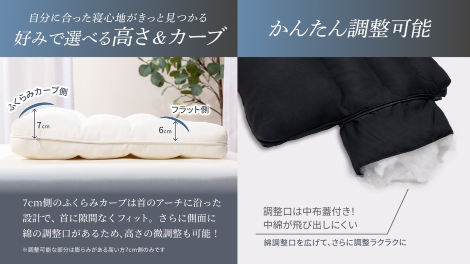 高さ調整は、片面が首元をやさしく支えるカーブ形状、もう片面がシンプルなフラット形状になっています。体調や寝心地の好みに合わせて面を使い分けられるのが特長です。さらに中材の出し入れで高さを微調整することも可能。ひとつの枕で2通りの快適さを楽しめるので、自分に合った眠り方を見つけやすくなります。