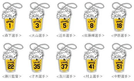 開催期間中、阪神甲子園球場でアルコール商品(※)をお買上げの方に、1杯につき「引換補助券」を1枚お渡しし、5枚集めた方にもれなく「阪神タイガース監督・選手ビール型アクリルキーホルダー(全10種)」を1つプレゼントします。