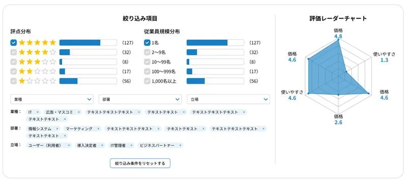 本機能は、DX・ITツールの導入を検討するユーザーが、実際の利用者による評価や使用感に基づいて製品を比較・判断できるよう支援することを目的としています。ベンダー提供情報だけでは伝わりにくい使用感や満足度を補完し、より納得感のある選定を後押しします。