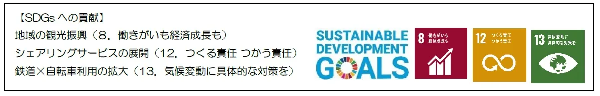 両社はこの度のシェアサイクルの拡大により、観光地における二次交通の充実、新たな周遊ルートの提供などを通じて、「鉄道×自転車」の新たな観光スタイルの提案や観光地活性化に取り組みます。