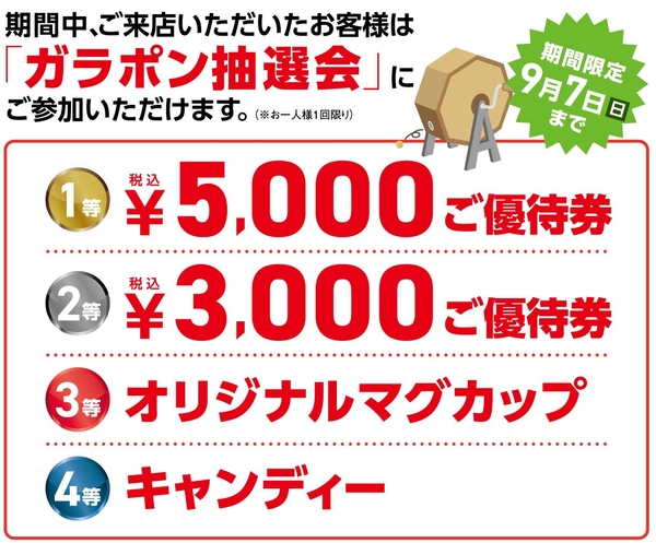 オープン日から9月7日まで期間限定で「ガラポン抽選会」を開催いたします。