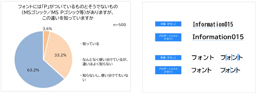 フォントに関する知識についても調査しました。フォントには、「MSゴシック/MS Pゴシック」や、「BIZ UDゴシック/BIZ UD Pゴシック」など、フォント名に「P」がついているものとそうでないものがあります。Pなしのフォントは等幅フォントで、かな・漢字は全角、英数は半角の等幅で表示されますが、P付のフォントは“プロポーショナルフォント”と言い、英数やかなの文字幅が文字の形によって異なります。この違いを知っているか聞いたところ、「知っている(3.6%)」と回答した人は1割にも満たない結果となりました。「なんとなく使い分けているが、違いはよく知らない(33.2%)」は約3割いました。フォント自体の存在を知っている人は一定数いるものの、フォントに関する専門的な知識は大多数の人が持っていないことがわかりました。