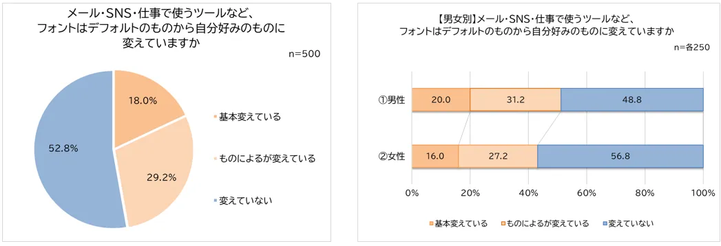 フォントは生活や仕事をする上で高頻度で目に触れますが、メールやSNS、仕事で使うツールなどにおいて、デフォルトのフォントから自分好みのフォントに変えている人はどれくらいいるのか調査したところ、「基本変えている(18.0%)」は約2割、「ものによるが変えている(29.2%)」は約3割で、半数近くの人が自分好みのフォントにカスタマイズしていることがわかりました。フォントにこだわりを持っている人とほぼ同数で、フォントへの意識と行動が直結していると考えられます。男女別で比較すると、自分好みのフォントに「基本変えている」「ものによるが変えている」と回答した男性は51.2%、女性は43.2%と、男性の方が若干ではありますがカスタマイズに積極的でした。