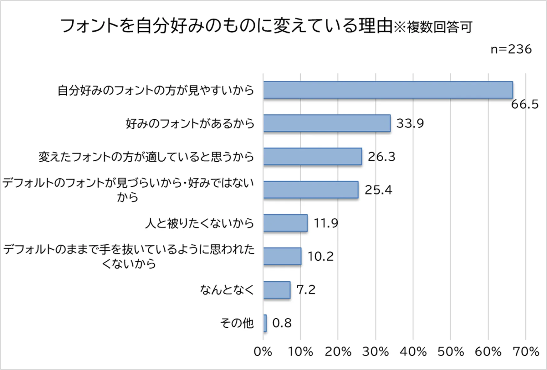 フォントを自分好みのものに変えている人にその理由を聞いたところ、「自分好みのフォントの方が見やすいから(66.5%)」、「好みのフォントがあるから(33.9%)」、「変えたフォントの方が適していると思うから(26.3%)」が上位に。フォントの選択は見やすさといった実用性を最も重視しつつ、好みに応じた選択も行われていることがうかがえます。