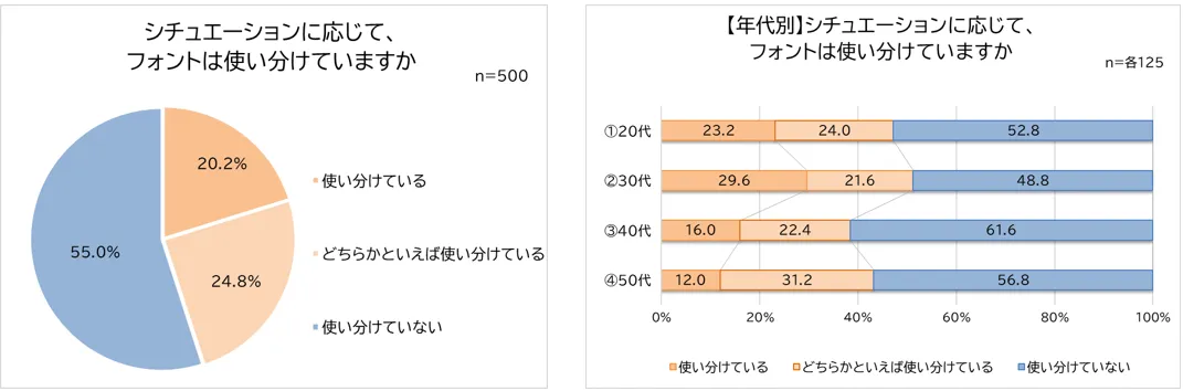 各ツールにおいてデフォルトのフォントから変えている人がいることがわかりましたが、プレゼン資料、謝罪文、催し事のお知らせなど、さまざまなシチュエーションに応じてフォントを使い分けているのかも調査しました。結果、「使い分けている(20.2%)」、「どちらかといえば使い分けている(24.8%)」を合わせて45.0%と、半数近くの人が状況に応じてフォントを使い分けている実態が明らかに。男女別では大きな差はありませんでしたが、年代別でみると、フォントを使い分けている人は20代で47.2%、30代で51.2%、40代で38.4%、50代で43.2%でした。比較的若年層の方が、フォントを使い分けている人が多い傾向にありました。