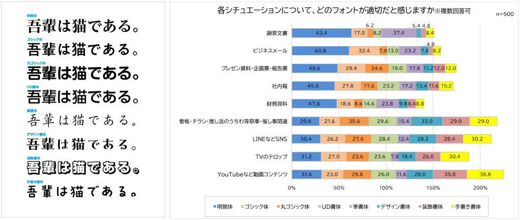 適切に使えている?働く男女に聞いたフォント事情! 約3人に1人、文書とフォントに違和感を覚えた経験あり! 「誠実さが伝わらない」謝罪で適切だと思うフォント1位「明朝体」 半数近くがフォントを使い分け!エピソード10選。好きなフォント1位「明朝体」2位「ゴシック体」3位「手書き書体」