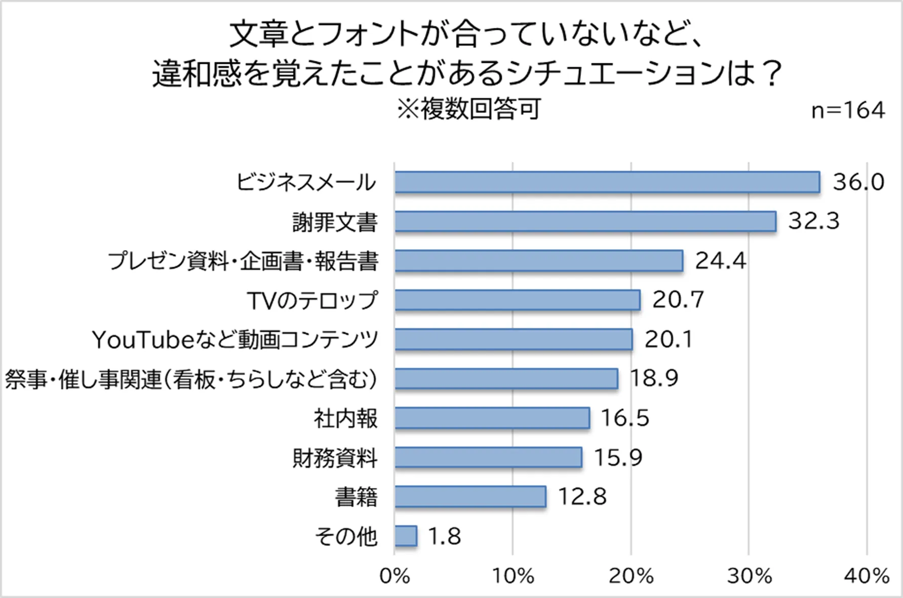 さまざまなシチュエーションに対して適切だと感じるフォントの傾向がわかりましたが、文章とフォントが合っていないなど、フォントに対して違和感を覚えたことはあるか調査をしました。「あてはまるものはない(67.2%)」と回答した人を除く、約3人に1人は違和感を覚えたことがあるようです。違和感を覚えたことがあるシチュエーション1位は「ビジネスメール(36.0%)」、次いで「謝罪文書(32.3%)」、「プレゼン資料・企画書・報告書(24.4%)」という結果に。仕事上で、違和感を覚えたことがある人が多いことがわかりました。どんな違和感を覚えたのか具体的に聞くと、フォントと文書内容のミスマッチが主な原因であるという声が多く寄せられました。フォントが無意識のうちに信頼性や書き手の誠意を判断する要素になっていることがうかがえます。フォントによって印象が変わり、伝えたい内容がうまく伝わらないこともあるため、適切なフォントを選択することが特に仕事上においては重要だと考えられます。