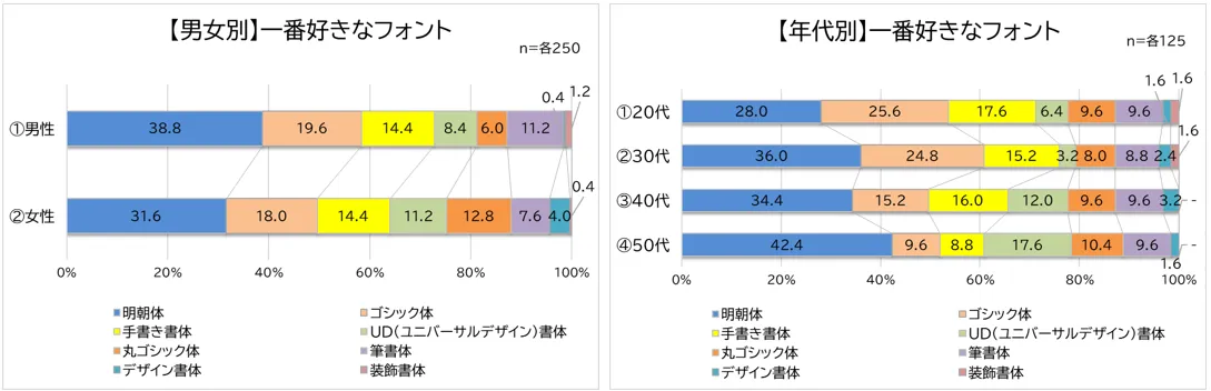 男女別でみると上位3位のランキングは全体と同じでしたが、4位は男性では「筆書体(11.2%)」でした。女性は「丸ゴシック体(12.8%)」で、男性の2倍以上の人が回答しました。年代別でみると1位は「明朝体」でしたが、2位は20代・30代が「ゴシック体(20代:25.6%、30代:24.8%)」、40代が「手書き書体(16.0%)」、50代が「UD書体(17.6%)」と年代によって好みがばらける結果となりました。