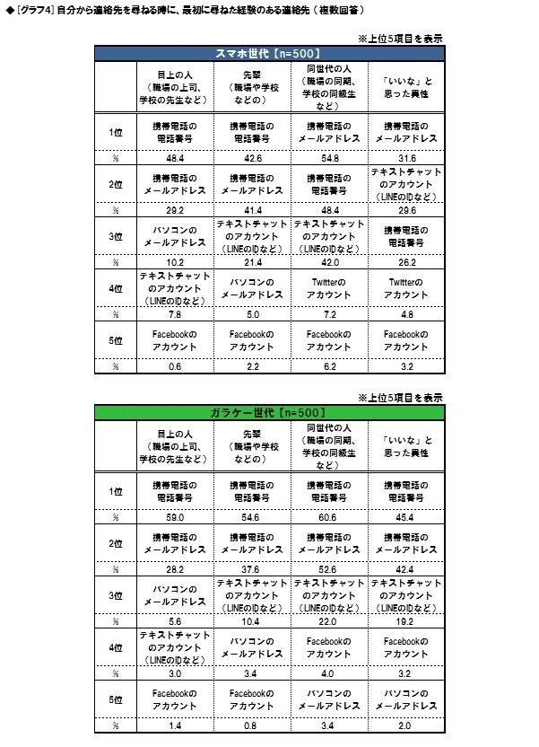 スマホ世代は、≪同世代の人≫や、≪「いいな」と思った異性≫に対しては「携帯電話のメールアドレス」の割合が最も高く、ガラケー世代は、いずれの相手に対しても「携帯電話の電話番号」を尋ねる割合が最も高くなりました。