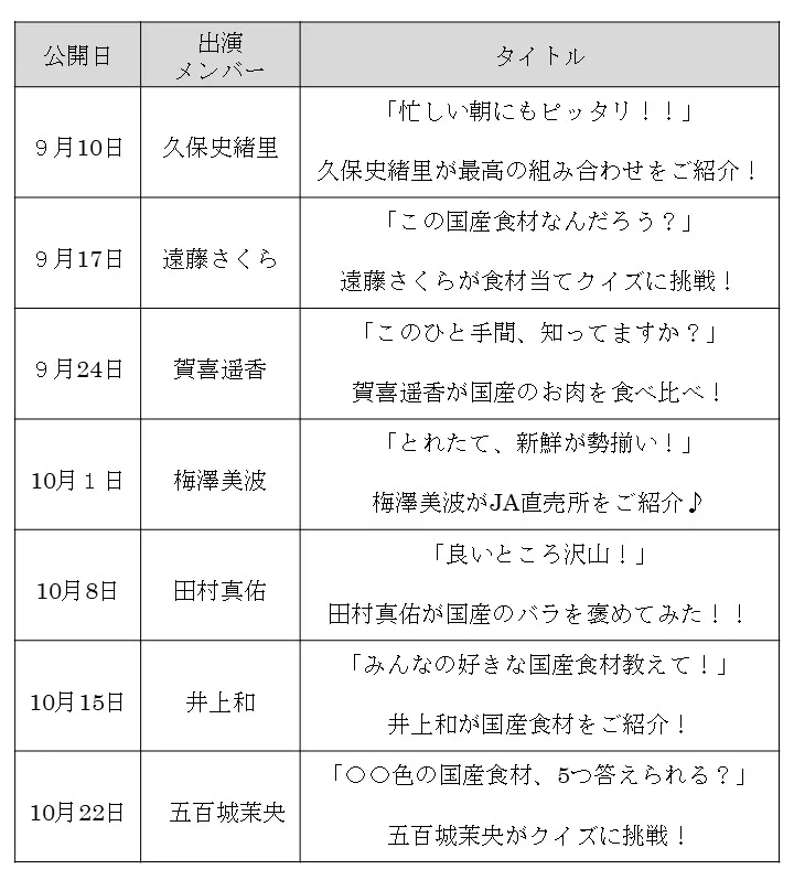 全国農業協同組合中央会(代表理事会長:山野 徹)は、乃木坂46と連携のもと、国産食材の魅力を広く発信するショート動画を制作し、令和7年9月10日(水)を皮切りに、10月22日(水)までの7週間、毎週水曜日に順次配信します。