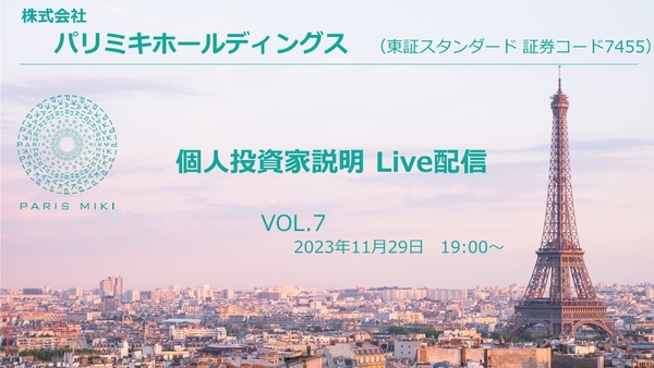 「パリミキ」を展開している株式会社パリミキホールディングス(本社:東京都港区、代表取締役社長:澤田将広)は、ログミー株式会社が提供する、投資家と上場企業との新たな出会いや相互理解を促進し、投資機会を創出するプラットフォーム「logmi IR Live」において、個人投資家向けにオンライン説明会を開催いたしますのでお知らせいたします。