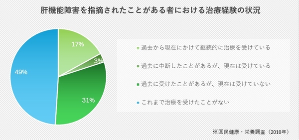近年、人間ドック総受診者316万人のうち、3人に1人が「肝機能異常」と指摘されており、その内、約49%は治療を受けたことがなく、51%は何らかの治療を受けたことがあるとのデータがあります。つまり、肝機能に異常を指摘されながらも、医療的な対応や日常的なケアが十分に行われていない層が依然として多いという実態が明らかになっています。