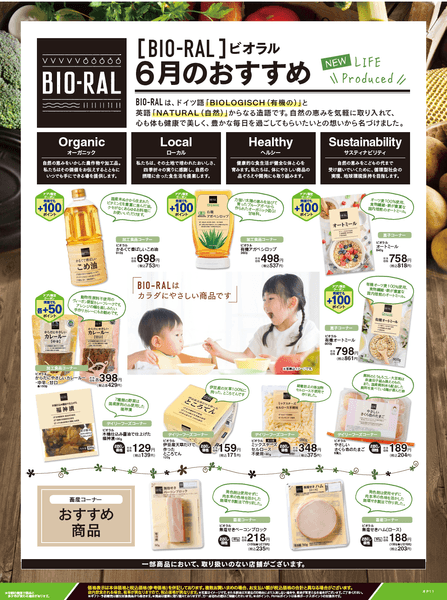 “BIO-RAL”とは、体に優しい素材や製法、健康や自然志向にあわせたプライベートブランド。「オーガニック」「ローカル」「ヘルシー」をコンセプトにこだわりの商品を取りそろえています。