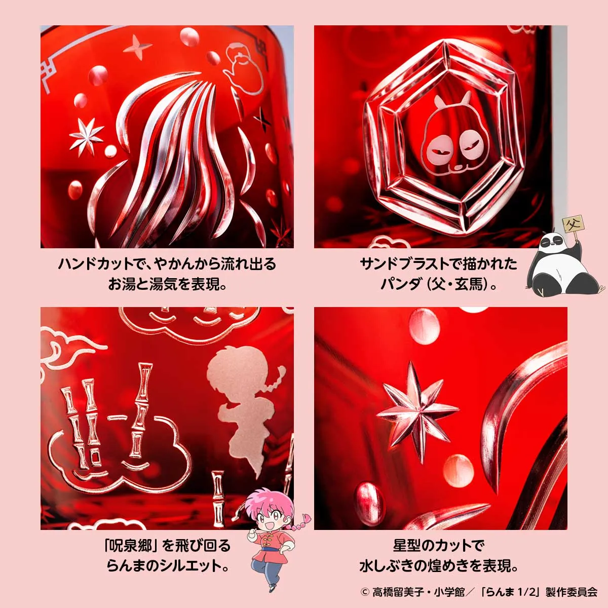 らんまの衣装にちなんだ鮮やかな赤色のグラス。お湯をかぶると男に戻る特異体質をイメージして、やかんから流れ出るお湯をハンドカットで表現。伝説の修行場「呪泉郷」や父・玄馬(パンダの姿)が遊び心いっぱいにデザインされています。