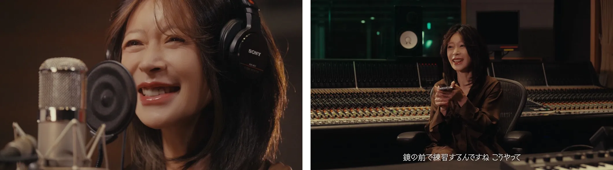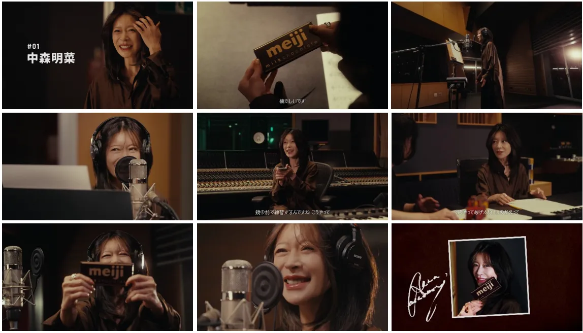 チョコレートのようなブラウンのシャツに身を包んだ中森さんが、録音スタジオに登場しました。デスク上に「明治ミルクチョコレート」を見つけると、弾んだ声で「わあチョコレート!」と嬉しそうに手に取ります。「最近、本当にチョコレートにハマっちゃって、毎日チョコレートを食べないといられないくらい」とチョコ愛を語ると、レコーディング室へ向かいます。笑みを浮かべながら、「チョコレート、チョコレート、チョコレートは明治♪」と、可憐で伸びやかな歌声を披露いただきました。ご自身の歌声をバックに、「たくさんコマーシャルの方にも出させていただいて、バレンタインデーの企画があって、鏡の前で練習するんですね、こうやって」と「明治ミルクチョコレート」との思い出を実演しながら当時を振り返ります。リズムに合わせて指を指揮棒のように振る姿や、スタッフと楽しそうに会話するレコーディング中の様子も公開されます。無事に収録を終えた中森さんは、チョコレートをデスクに戻し、来月公開のアーティストへとバトンを繋ぎます。