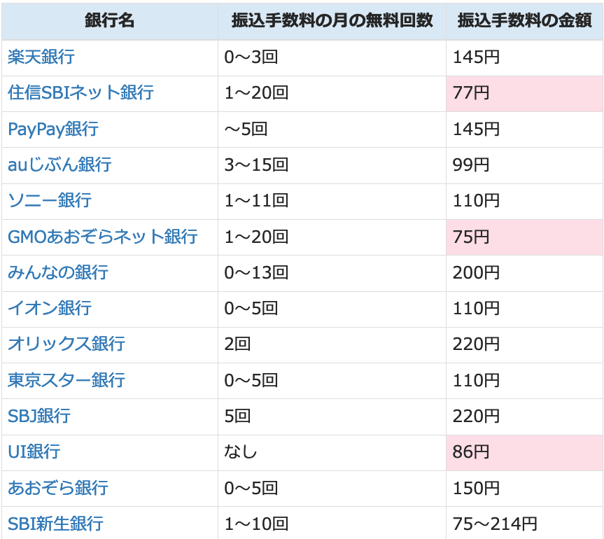 ネット銀行振込手数料14社比較表【2024年10月】