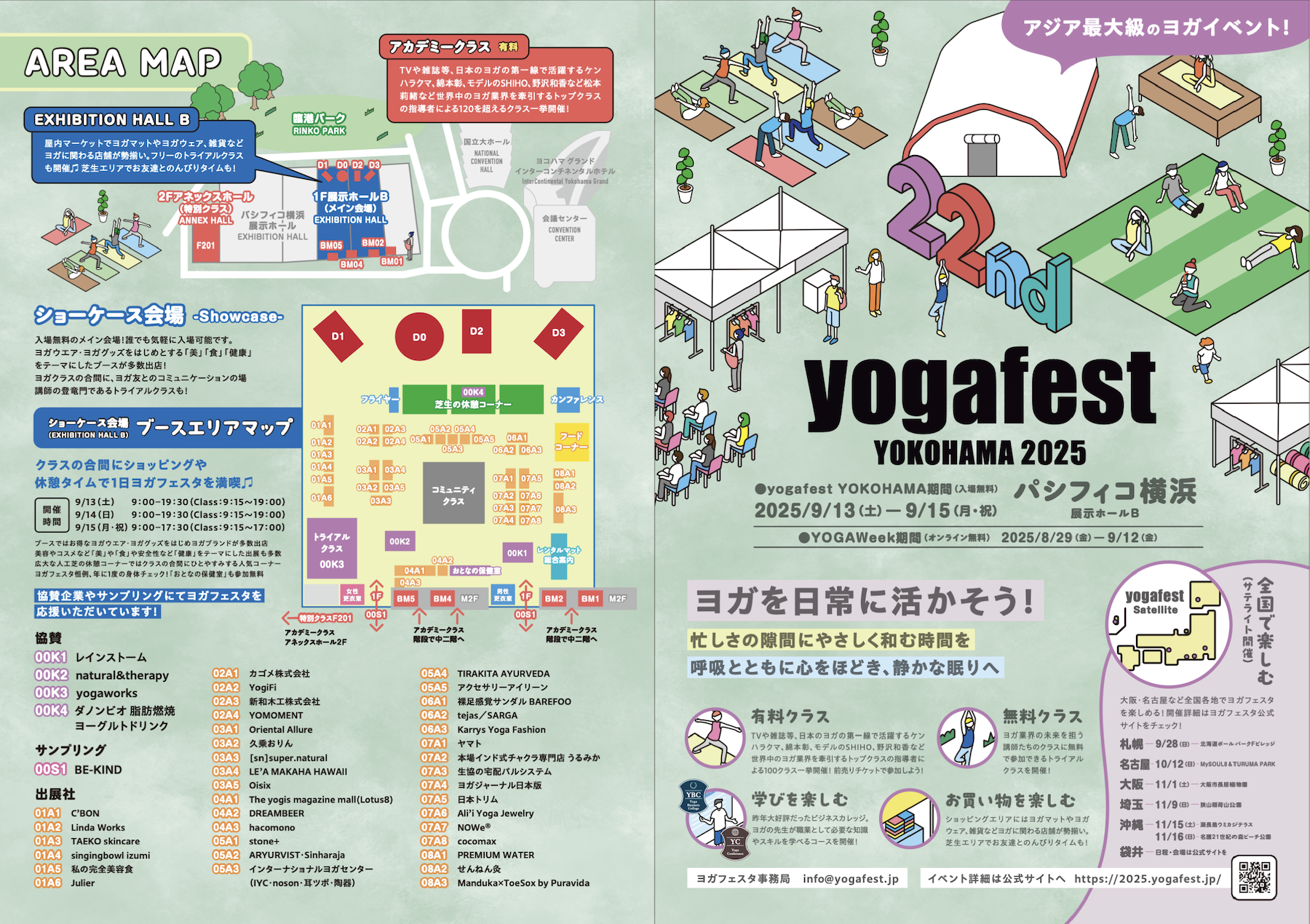 株式会社ヨガタウン(東京都渋谷区)は、2025年9月13日(土)~15日(月・祝)の3日間、パシフィコ横浜にて「ヨガフェスタ横浜2025」を開催します。22回目となる本イベントは、延べ2.5万人が参加するアジア最大級のヨガイベントです。