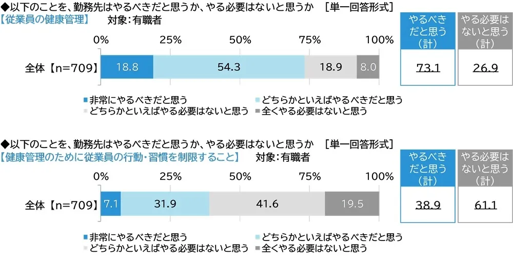 「従業員の健康管理をするべき」73%、「健康管理のために従業員の行動・習慣を制限する必要はない」61%