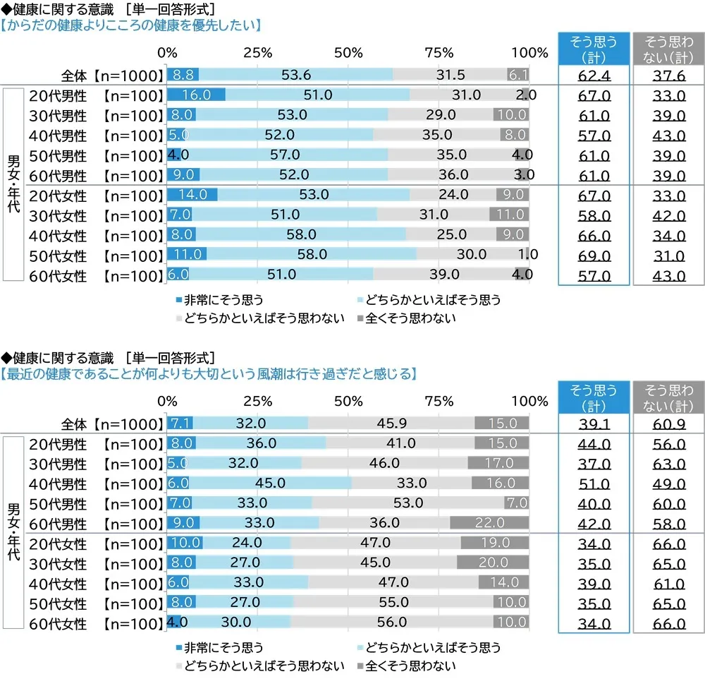 ◆「からだの健康よりこころの健康を優先したい」62%、50代女性では69%