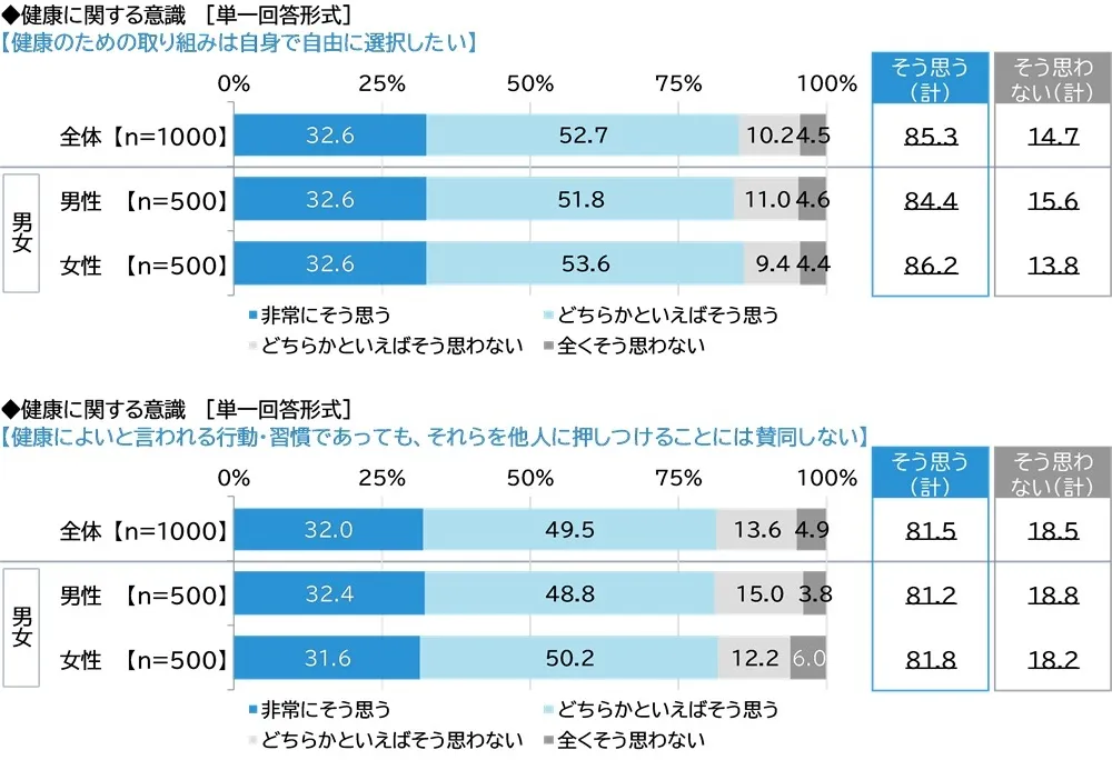 また、【健康のための取り組みは自身で自由に選択したい】では『そう思う(計)』は85.3%、【健康によいと言われる行動・習慣であっても、それらを他人に押しつけることには賛同しない】では『そう思う(計)』は81.5%と、いずれにおいても、肯定する人が8割以上となった。健康のためであっても、各個人に合った取り組みや習慣を自由に取り入れることが望ましいと考える人が多いようだ。
