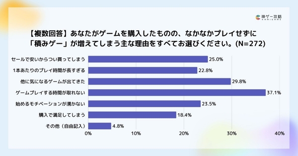 ・積みゲーの理由で最多は「プレイ時間が取れない」(37.1%)、次いで「他のゲームに目移り」(29.8%)