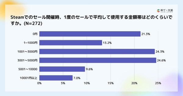 Steamでのセール開始時のゲーム購入本数は、年1〜2回ほどが32.4%で最多。次点でセール時でもほとんど買わない人が30.5%という結果でした。