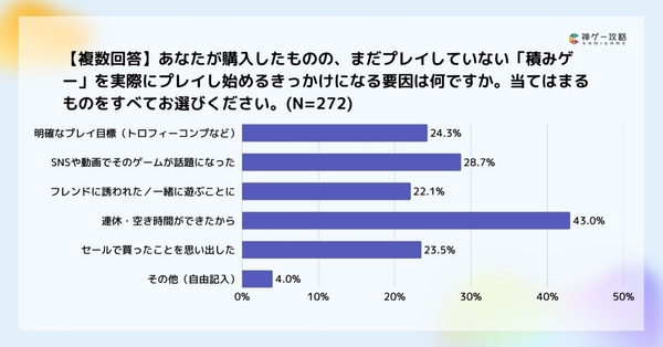 ・積みゲーをプレイし始めるきっかけは「連休・空き時間ができたから」が最多(43.0%)