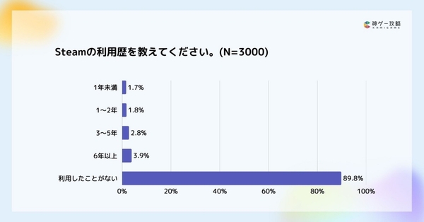 非ゲームユーザーを含む3,000人を対象に行った事前調査では、Steamを利用しているユーザーは全体の約1割でした。以降では、この1割の中から回答のあった272名を対象に、本調査結果を発表します。