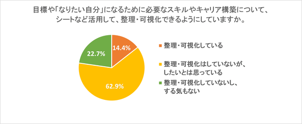 WBCで活躍された大谷翔平選手が高校時代に「目標設定シート」を用いていたことが話題になりましたが、そのようにシートなどを活用し、人生設計やキャリア構築について考え、整理・可視化できるようにしているか質問したところ、62.9%が「できていないが、したいと思っている」と回答しています。
