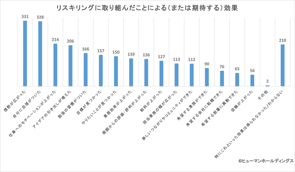 リスキリングに取り組んだことでどのような効果があったか(これから取り組む人に対しては期待する効果)について質問したところ、「視野が広がった(32.1%)」「自分に自信がついた(31.8%)」「仕事へのモチベーションが上がった(20.7%)」「アイデアの引き出しが増えた(20.0%)」など、自身のメンタル面でプラス効果が多く、一方で昇給や希望するポジションへの異動(転職含む)に対する影響は低い結果となりました。また、効果を実感できていない人も20.3%と多い傾向にあります。