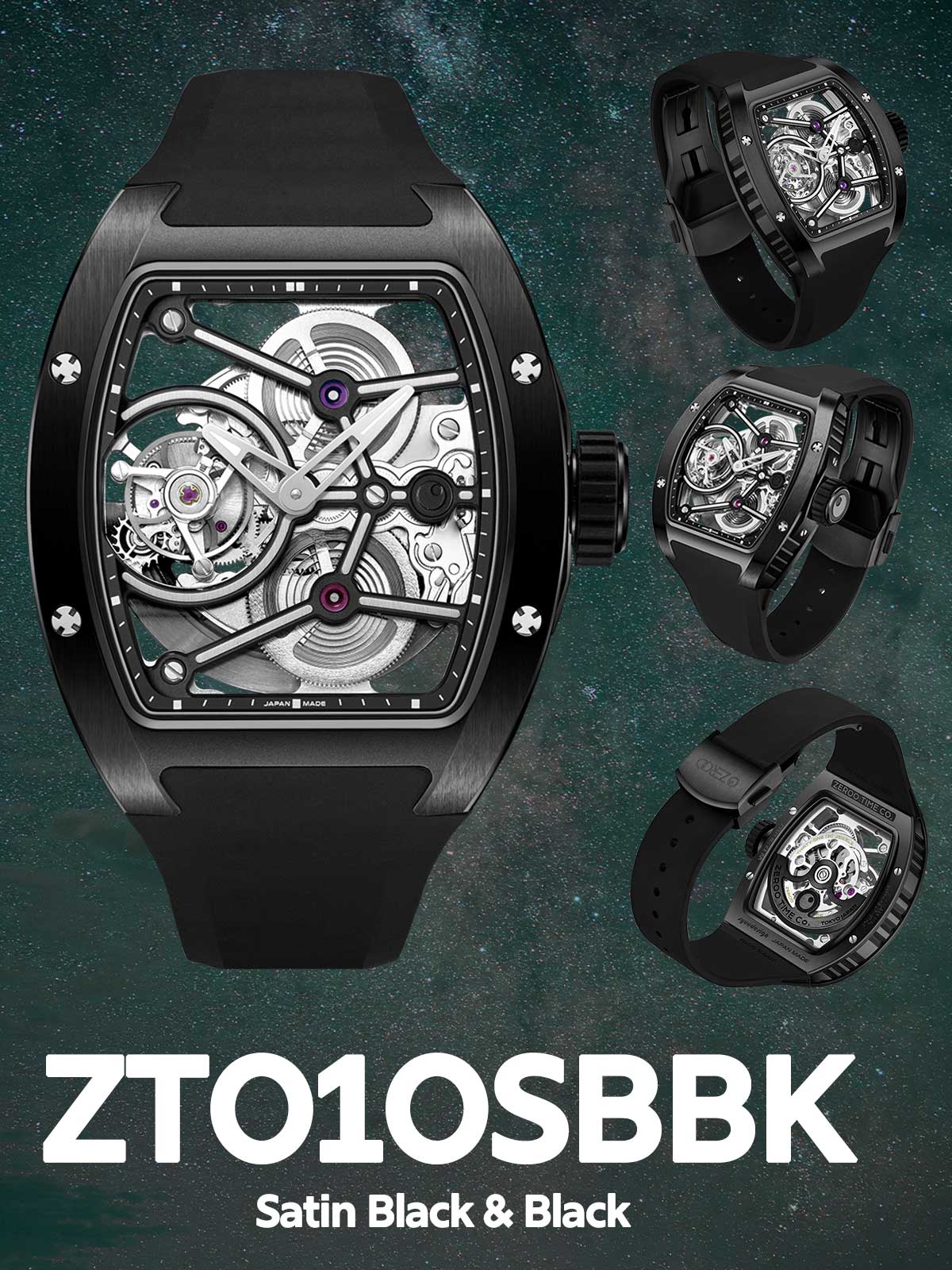 T10は、全世界で高評価を得た手巻式T4の哲学を継承しながら、新開発Cal.ZT08自動巻ムーブメントを搭載。約60時間のパワーリザーブを実現し、利便性と機構美を両立しています。ケースはT10のために新規開発したトノー型オリジナルデザインで、立体フィン形状の側面、サファイアクリスタル風防、裏蓋スケルトン構造により、ローターやトゥールビヨンの動きを前後両面から鑑賞可能です。