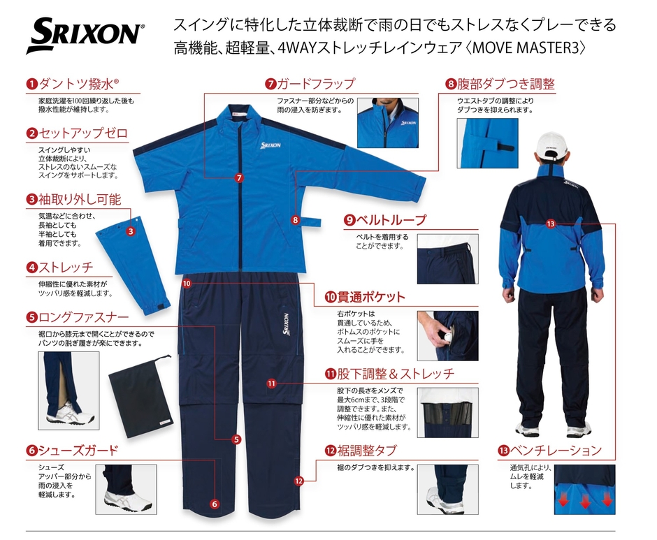 住友ゴムグループの(株)ダンロップスポーツマーケティングは、水切れの良さが体感できる高耐久撥水素材「ダントツ撥水®」※2と、ゴルフスイングに特化した立体裁断の「セットアップゼロ」で、雨の日でも快適にプレーできるスリクソン レインウエア「MOVE MASTER3」を2025年9月13日から販売します。