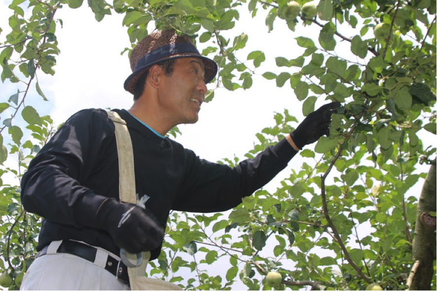 しかし、握りこぶしほどある大きさの「摘果リンゴ」を見て「もったいない」と感じ、何か活用できないかと模索し、地域のリンゴ生産者、地域のJA、マツザワが共同で、いろいろな方法を考え実行。消毒の種類と散布するタイミングを変更し、テストを繰り返し、新たな防除体系をつくり出し、地域をあげて摘果リンゴを食用利用する仕組みをつくりあげました。