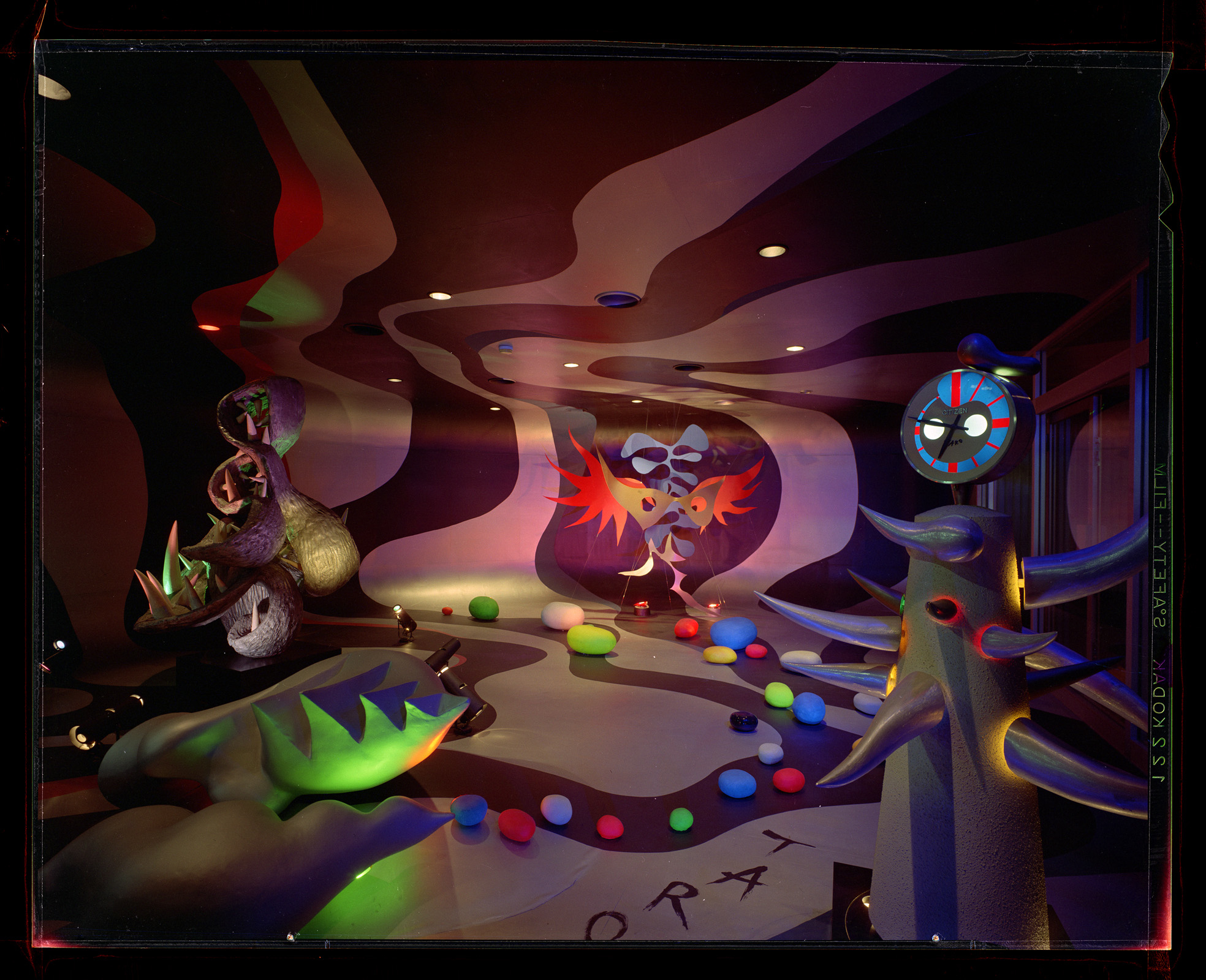 普通の画家の視界にあるのは、絵を描く“板”とそれを飾る“壁”くらいだけど、太郎の脳内座標は3次元で、しかも射程距離がエンドレス。歌舞伎の舞台をつくり、ディスプレイ空間をデザインし、野外広場を制作し、あげくに銀座の夜空にヘリコプターで絵を描き、池袋の駅前に巨大なクリスマスツリーを突き立て、万博会場に70mの巨像を屹立させました。