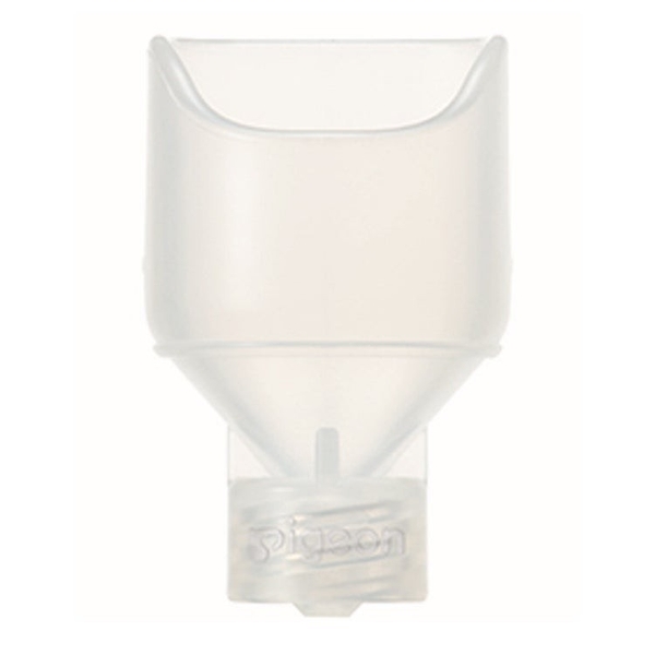 本商品は、初乳採取のために病院で用いられているシリンジに装着して使用する、漏斗のようなデバイスです。手でしぼってさく乳し、にじんだ初乳をすくい取るように商品に集めます。