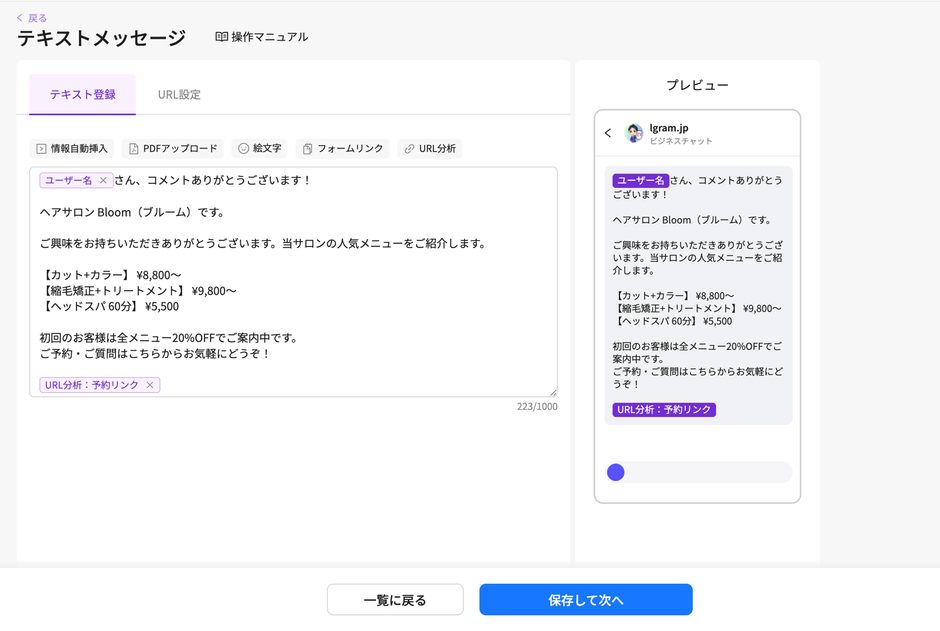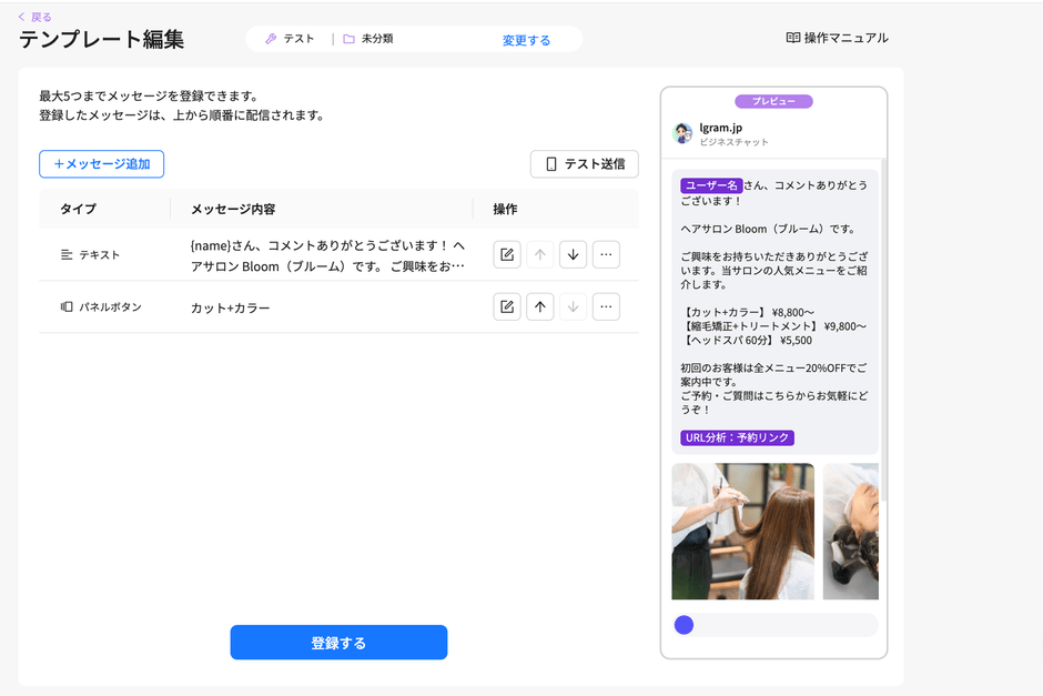 エルグラムのテンプレート機能は、あらかじめ作成したメッセージを保存し、自動応答やDM配信などさまざまな場面で呼び出せる機能です。