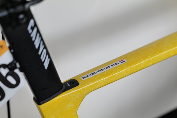 マチュー・ファンデルプールが第3ステージから使用しているのが、MyCanyon「カリーナ」アートワークの技法を用いたマイヨジョーヌ特別仕様。フィリプセンのバイクと同じく、手押しスタンピングプロセスで塗装されています。
