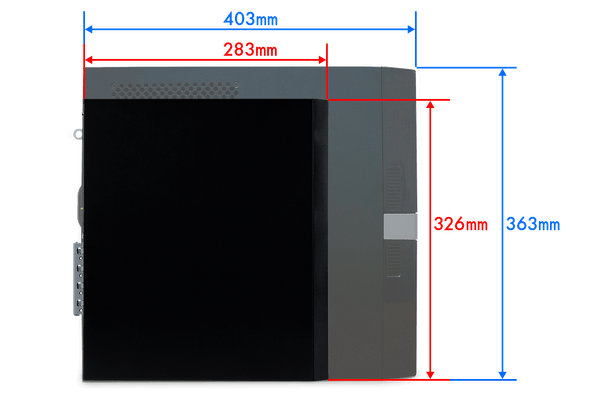 当社従来のスリムパソコンの容積14.3L(約幅98mm×奥行403mm×高さ363mm)に対して、8.76L(約幅95mm×奥行283mm×高さ326mm)のスリムケースを採用、約38%の大幅なサイズダウンを実現しました。デスク周りのスペースに余裕を持たせたい方におすすめです。