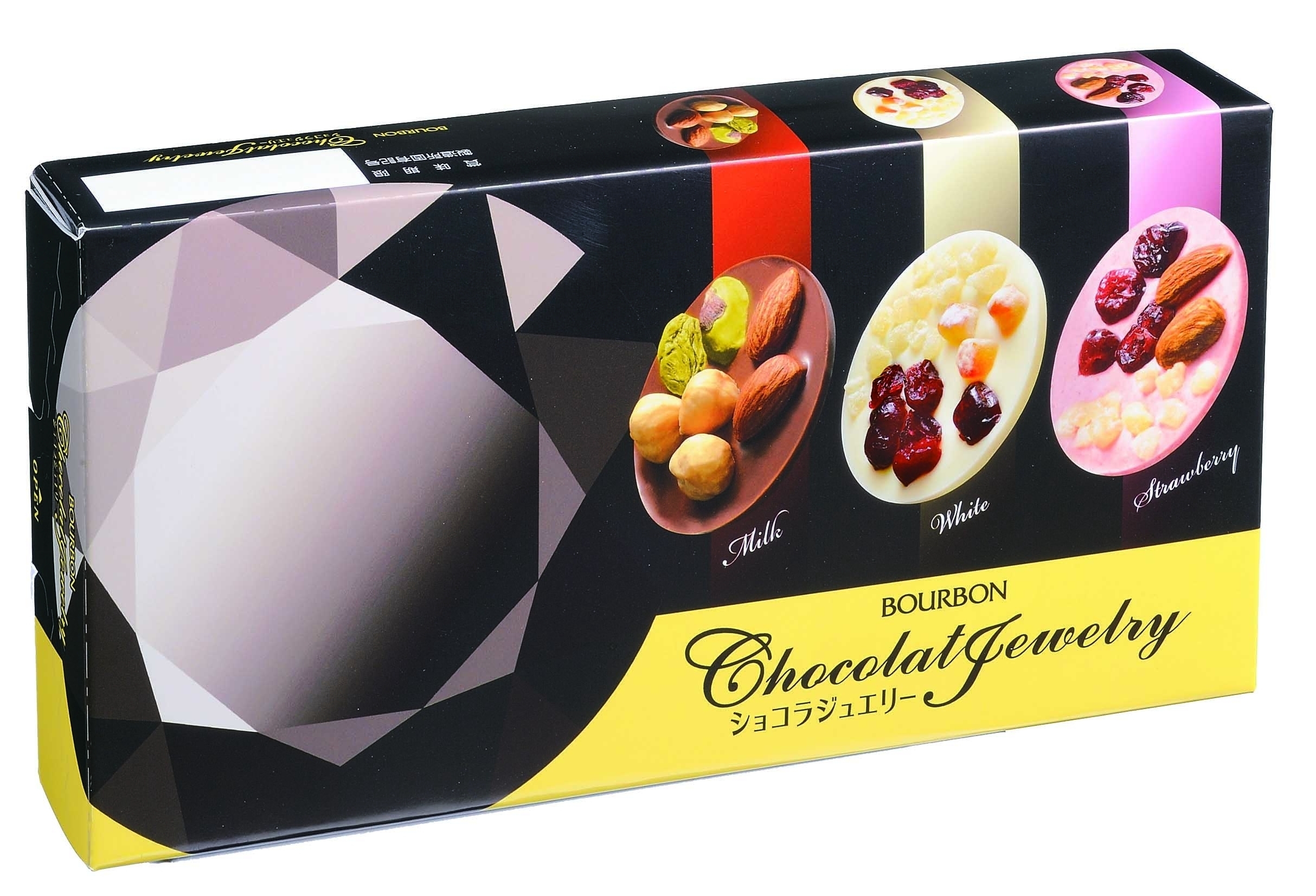 薄く丸い板状のチョコレートにナッツやドライフルーツをトッピングした“高級感”“彩り”“色々な味が楽しめる”をコンセプトとした見た目にも華やかなチョコレートです。この商品限定のストロベリー味を加え、ミルク、ホワイト、ストロベリーの3種類の味が楽しめます。