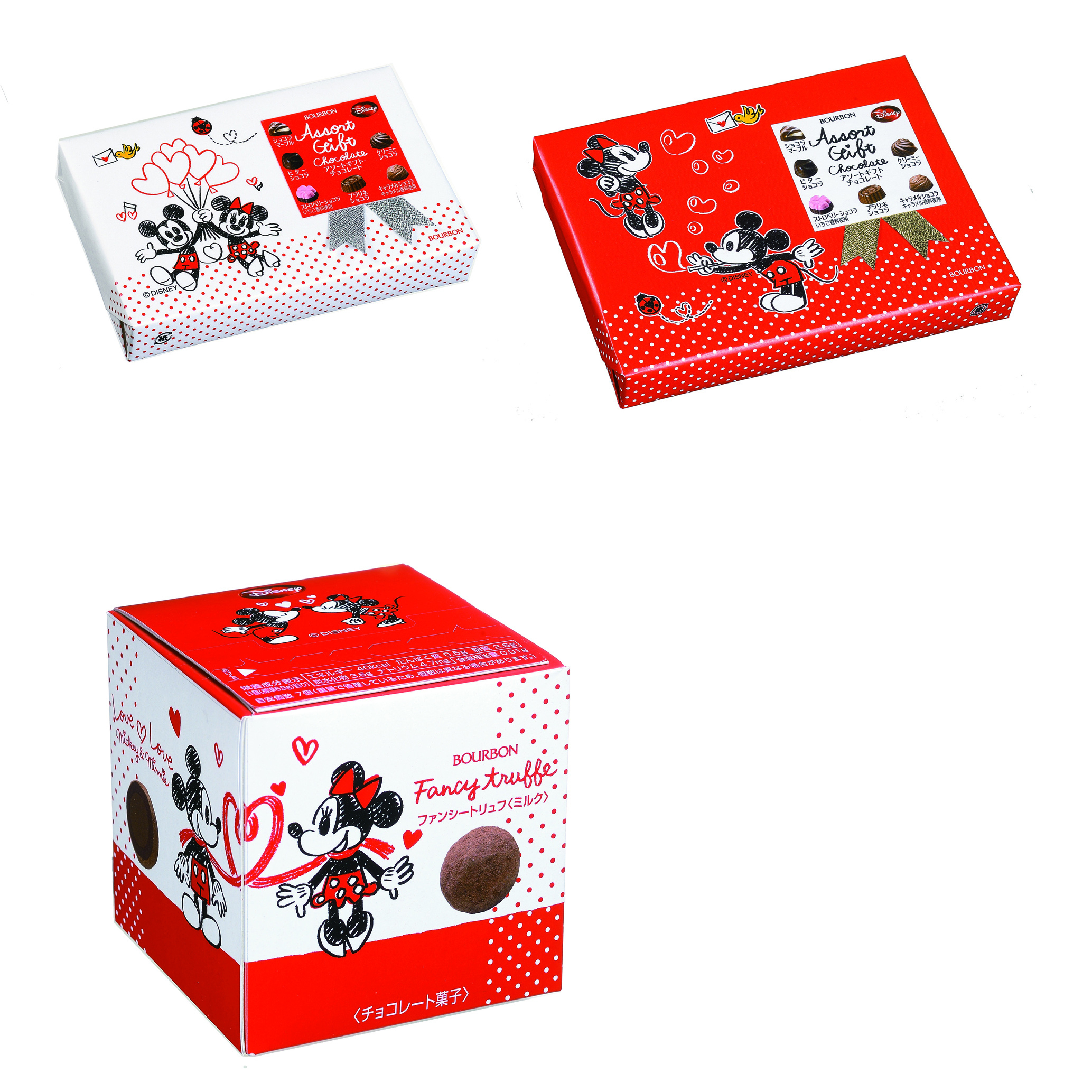 6種類のチョコレートを詰め合せたバラエティ感のある商品です。手書き風のミッキーマウスをデザインしたかわいらしいパッケージとしました。サイズの違う2種類を用意しました。