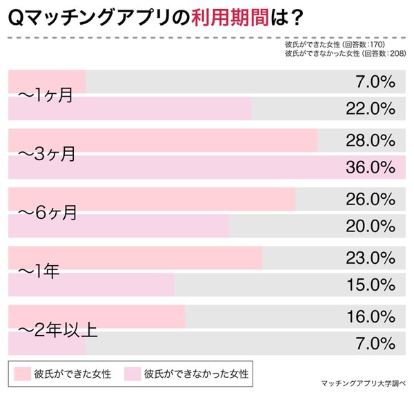 恋人ができた男性は3ヶ月以上の利用が73%に対し、恋人ができなかった男性は3ヶ月以上の利用が57%と全体的に短くなっています。
