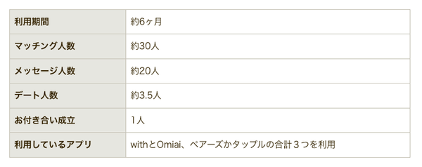 この調査結果を見ることで、自分がマッチングアプリを使った際に、どのような成果が出るのかを考えたり、アンケート結果の平均と比較して自分成果を確認したりしてみてください。