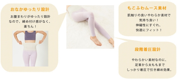 本商品は、肌触りの良いまるでムースのようなあたたかもこふわ素材の着圧レギンスです。段階着圧設計で、足首は20hPaとしっかり引き締め、キュッと美脚効果。お腹はゆったりと縫い目のないシームレス仕様で、ゴロつかないノンストレス設計になっています。脚をしっかり引き締めつつも、お腹は楽に過ごしたい方におすすめ。