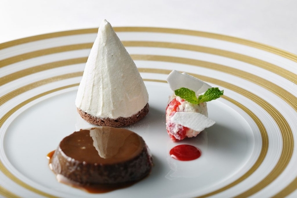 栗のクリームを生クリームで包んだ、「白い山」という意味のドルチェです。この円錐状のモンブランは雪が降り積もったトマムの雄大な山をイメージしました。また、ブネはラム酒のほのかな香りがする、ココア風味のプリンです。程よい苦みと上品な甘さを感じられるスイーツが、コースの最後を締めくくります。