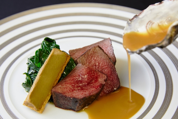 コースのメイン料理は、柔らかく雑味のないエゾ鹿肉のローストです。大きく角切りにした鹿肉は、旨味が凝縮され、噛むほどに味わいが広がります。合わせるのは、糖度の高い寒締めのほうれん草とオイスターソースです。このソースには牡蠣の煮汁と塩味のある鹿肉の出汁を使用し、コクのある味わいに仕上げました。また、牡蠣の身とフォアグラをペースト状にし、カリカリに焼き上げた薄いトーストに載せたメルバトーストを添えます。旨味が凝縮されたソースやトーストが、シンプルな鹿肉の旨味を引き立てます。