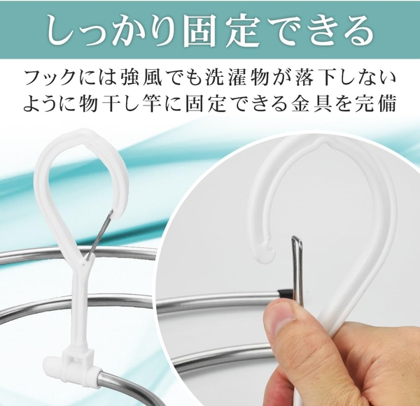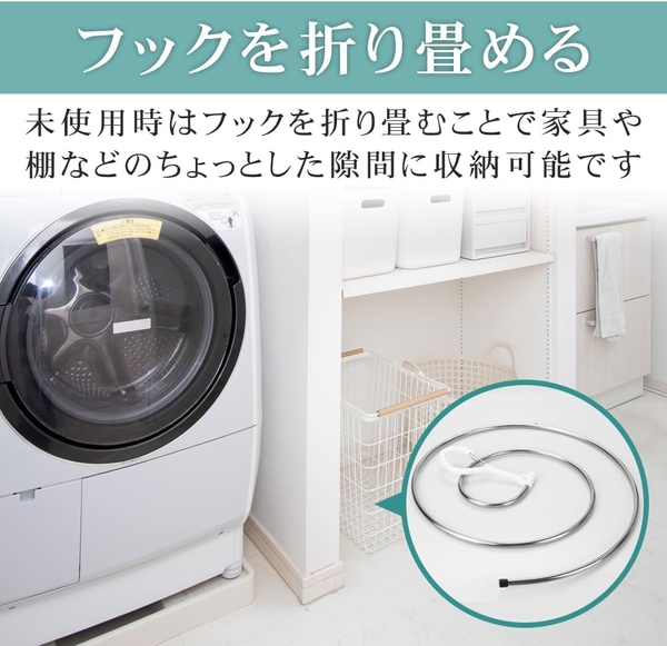 物干し竿に引っ掛けるフックには風が吹いても落下しないように、しっかり固定できる金具を完備。未使用時はフックを折り畳むことでちょっとした隙間に保管可能です。何かと大きな洗濯物が増える夏は効率良く乾かすことが大切です。"夏の洗濯をもっと楽に、もっと快適に!"スパイラルハンガーを活用することで家事の時短にも繋がりますので、この機会にぜひお試しください。