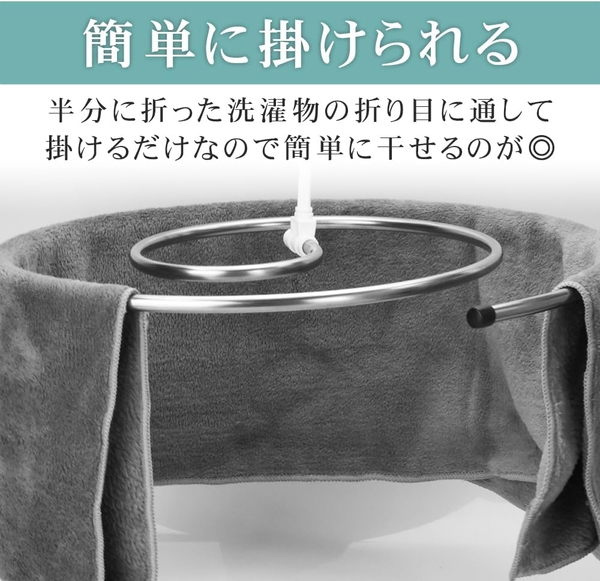 半分に折った洗濯物の折り目にハンガーを通すだけで簡単に干せます。洗濯物を外す際はスルスル引っ張るだけでスムーズに取り込めます。本体は360度回転する仕様により、風がどの面も均等に当たるため乾燥効果がアップ!さらに向きを自由に変えられるところもポイントです。
