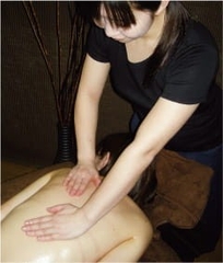1.ウエスト背中から腰を通して、おへそに向かうようにマッサージ。おへそ横から脚の付け根まで一気に流して仕上げます。